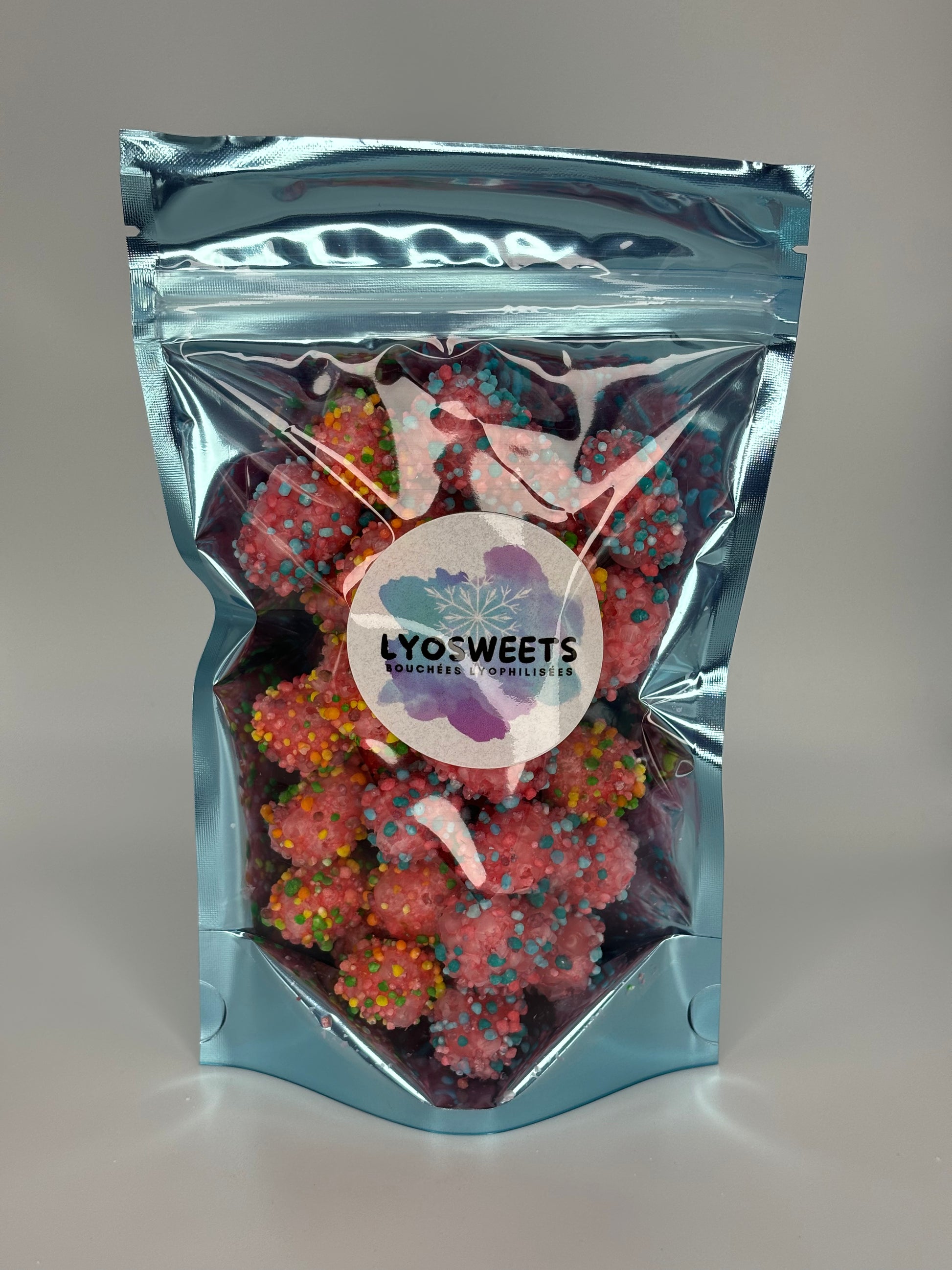 Ingrédients: dextrose, sucre, sirop de maïs, amédice de mais modifié, gélatine, contient 2 % ou moins d'acide malique, d'acide malique, d'acacia, de saveurs naturelles et artificielles, cire de carnauba, couleur ajoutée